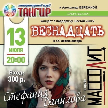 Напомним, что Стефания Данилова является петербургской поэтессой, уже успевшей написать 6 книг, победительницей нескольких престижных конкурсов и премий. На предстоящем концерте зрители услышат не только песни на стихи поэтессы, но и отрывки из книги «Веснадцать», которая появится на книжных прилавках уже в августе. Прямо во время концерта у поклонников Даниловой будет возможность задать поэтессе интересующие вопросы. В конце концерта пройдет автограф-сессия, а также превью книги Елены Марчуковой.